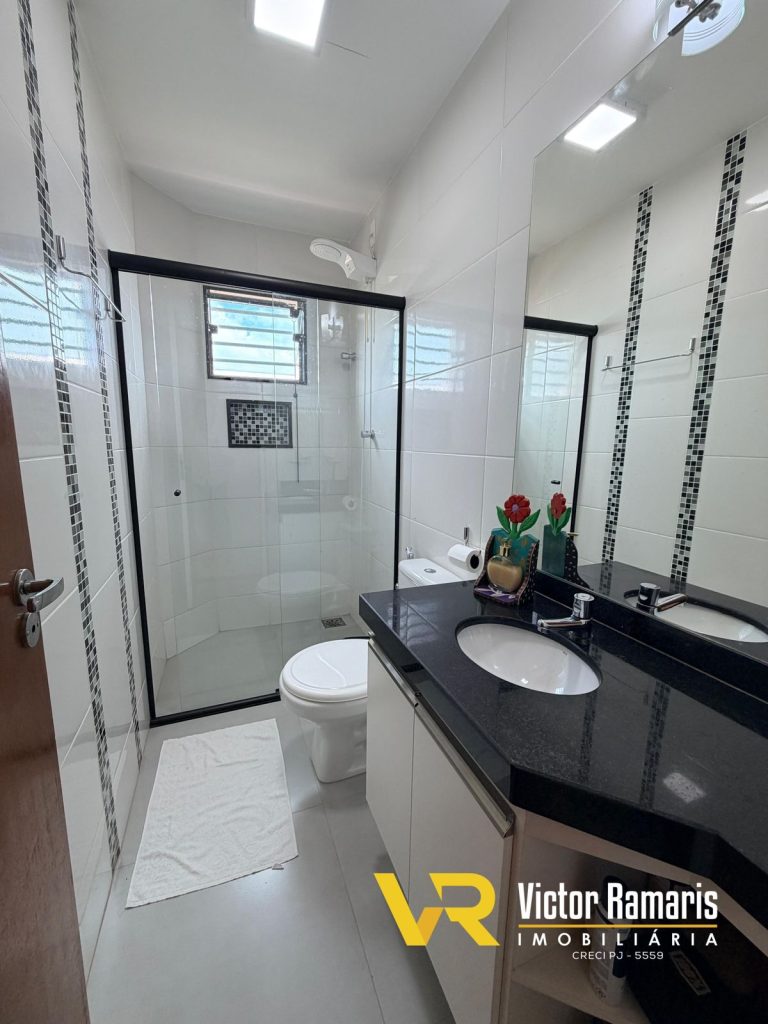 * Banheiro social com armário, box e espelho